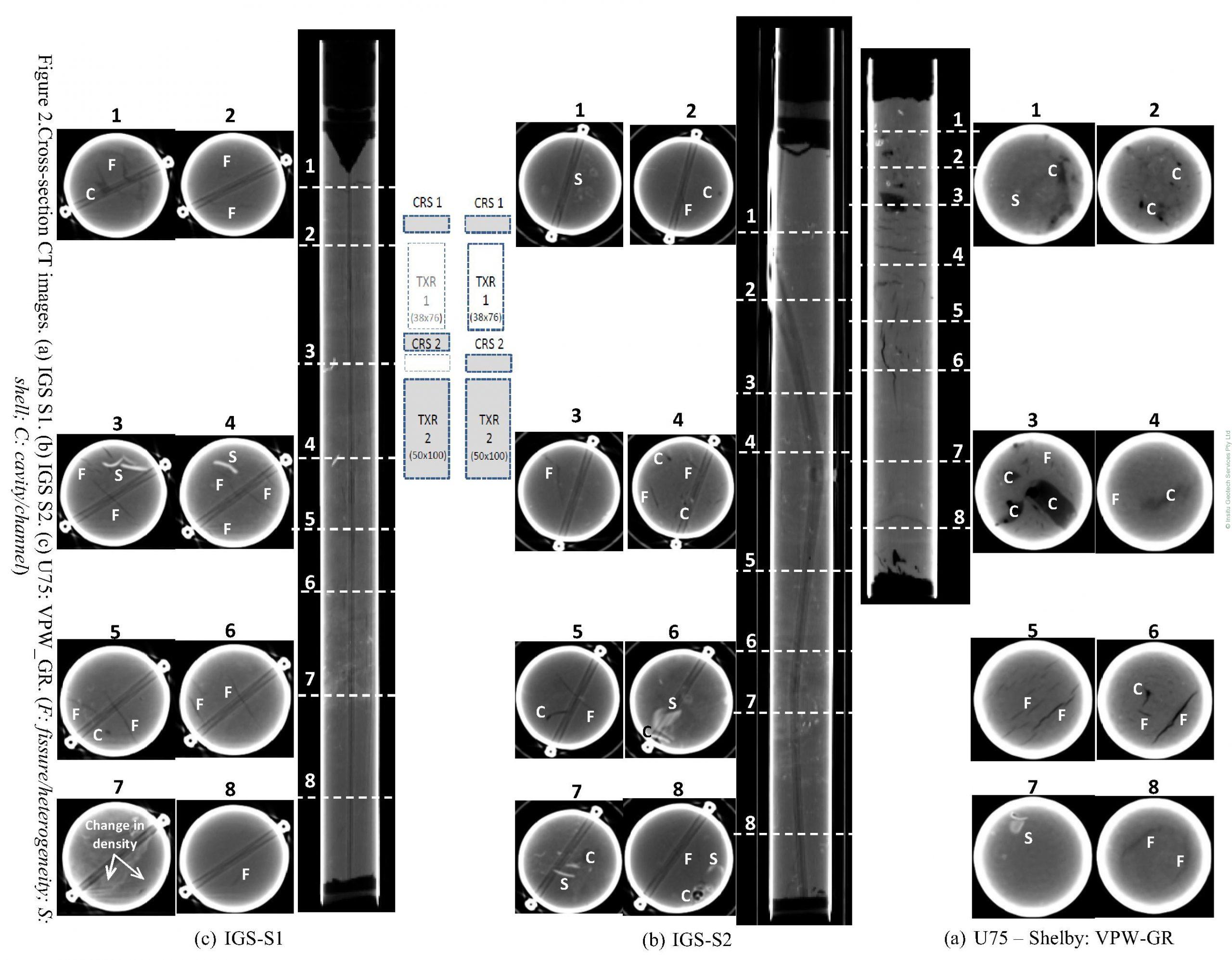The figure shows CT scan images of two PPI soft clay samples (left and center) and a standard U75 sample (right).